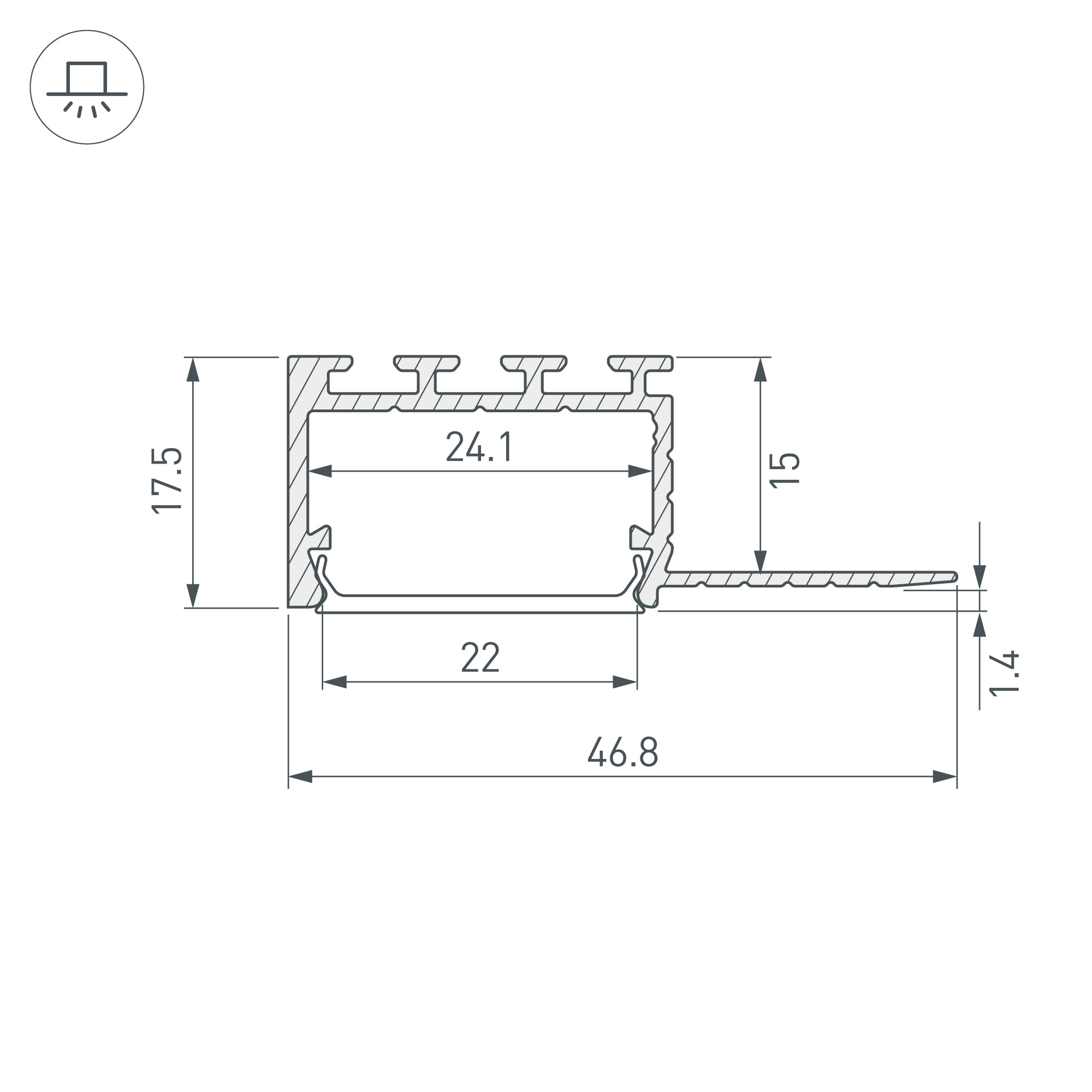 Алюминиевый угловой профиль для светодиодных лент и линеек. Встраиваемый в гипсокартон, под строительную отделку. Позволяет создать линию света шириной 24 мм. по контуру элементов интерьера , без видимых частей алюминия. Габаритные размеры (L×W×H): 2000x46,8x17,5 мм. Ширина площадки для ленты 24,2 мм. Экраны, заглушки и другие аксессуары приобретаются отдельно. Цена за 1 метр.