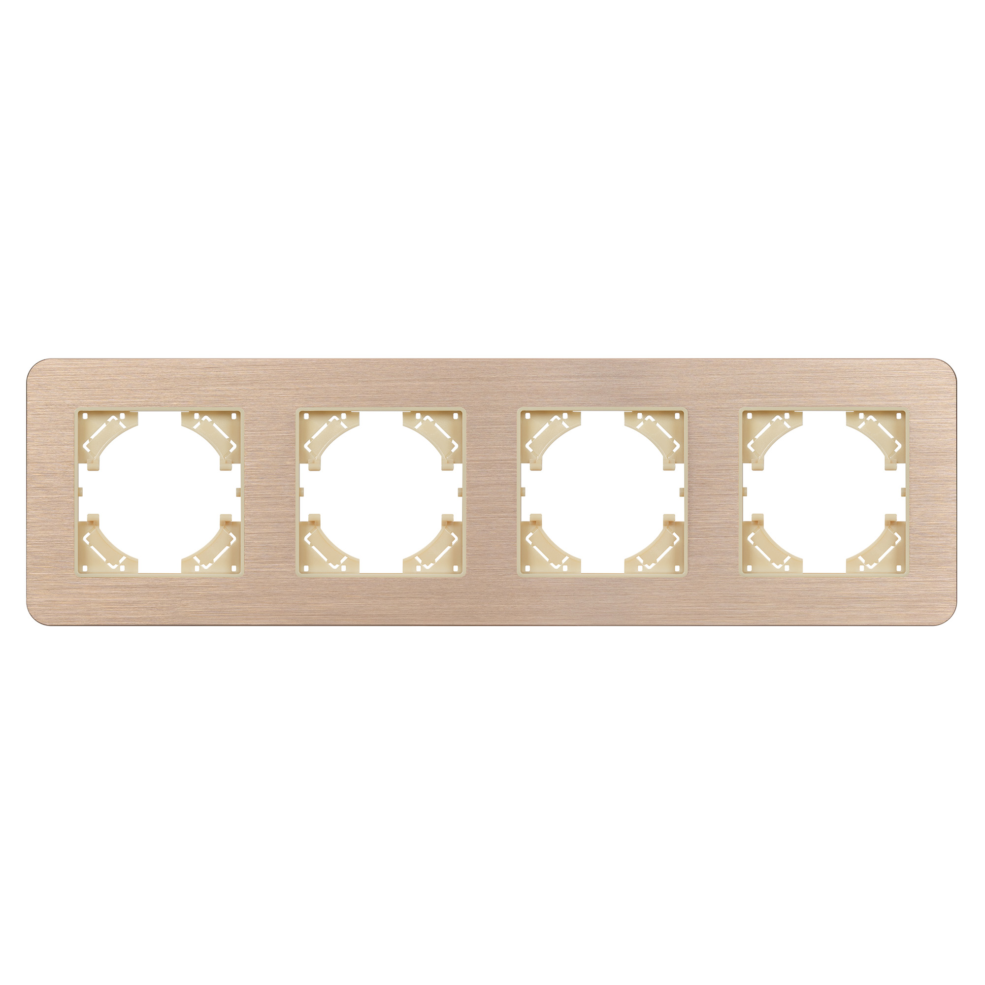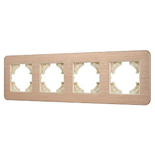Рамка алюминиевая на 4 поста, под встраиваемый механизм. Цвет - золотой. Среднего уровня герметичности IP20. Ориентация монтажа - горизонтальная (основным ориентиром служат посадочные выступы для накладки механизма).